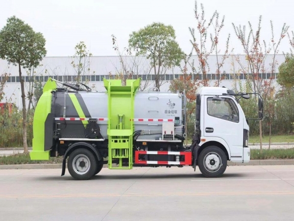 餐厨垃圾车,又称餐余垃圾车、余厨垃圾车或者泔水车,餐厨垃圾车是垃圾车中的一种,是用于收集和运输生活垃圾、食品垃圾(泔水)专用车辆。上装由箱体、后门总成、后门开启机构、密封锁紧机构、推板机构、挂桶提升机构及操纵机构等组成。有装、卸垃圾自动化程度高、工作可靠、密封性好、装载容积大、操作简便、作业过程密闭,无污水泄露和异味的散发,环保性好等特点。餐厨垃圾车不仅优化了居民居住的环境卫生,减少了空气中的餐厨垃圾臭味,减少孳生蟑螂、细菌的可能, 改善了环卫作业环境,减少垃圾的四处分散造成的污染。