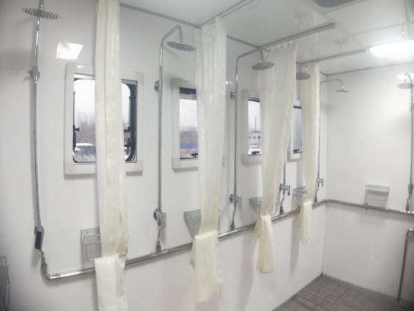 1、车内共有 3 个区域,分别为后更衣区、中淋浴区、锅炉区燃油热水锅炉、不低于2.8KVA 柴油发电机、水泵、精密过滤器、暖风机、灭火器、通风窗、照明灯;淋浴间设置 12 个淋浴喷头、不锈钢水箱、皂盒、通风窗、照明灯;内设要有更衣柜、衣帽钩、照明灯、换气扇等配套设备。(配套设备漏掉*需增加)。
