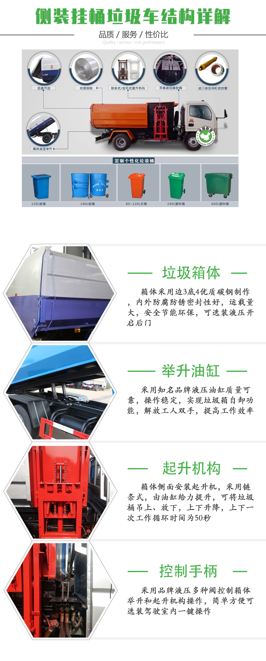自动举升垃圾桶倒入垃圾,提升机顶部带机械翻盖,箱体底部双液压举升自卸,液压系统控制提升机上升+下降+自卸作业,箱体后部设有挡水槽,尾部装有橡胶密封条,防污水滴漏。适用于城乡街道垃圾桶、生活区垃圾桶、工业园区垃圾桶的垃圾收集转运。
