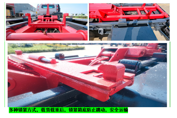 ◇上装配置:强度合金钢一体式主勾臂,加强型副梁,铸钢尾托轮,手自一体室内外液压操控,上装提升能力6000KG, 液压完成上箱+下箱+锁紧+自卸等作业,实现一车配多箱的循环转运。可采用加强型上装,伸缩臂,油缸加粗,加装液压支腿,搭配建筑垃圾箱使用,提升能力10000Kg。