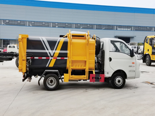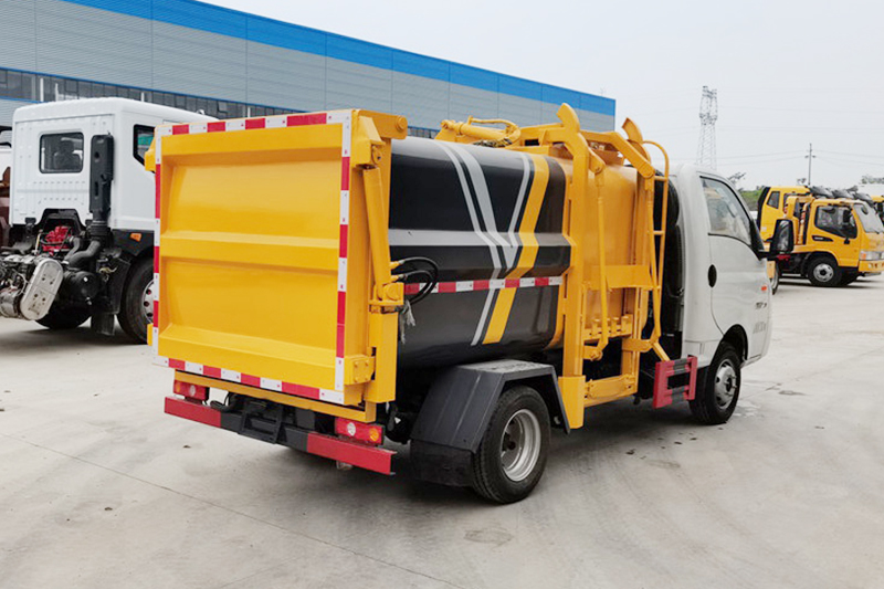 侧装式压缩垃圾车属于自装卸式垃圾车的一种,采用侧提桶上料方式进行生活垃圾收集,采用推板推挤或自卸式进行卸料。主要结构:汽车底盘、垃圾厢体、底架、侧提桶机构、后门总成、推板总成、液压系统和电控系统。液压及电控系统由油泵、油缸、油箱、电液**阀、PLC和**开关等组成。同时本车自重轻,箱体为圆弧形,容积大,同等车型中装载量**,并且美观大方。