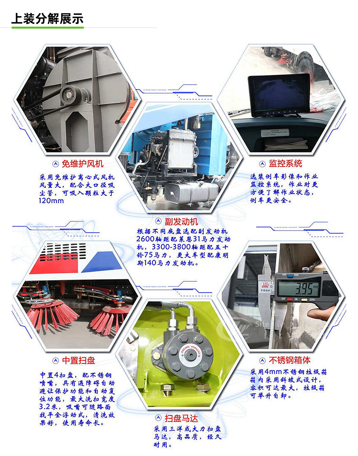 带扫盘4把,江铃副发动机;大力马达;施耐德控件开关;台湾电磁阀组;免维护自分离式离合器;免维护风机;不锈钢水箱;不锈钢垃圾箱;尾部LED箭头灯;手动泵应急系统;刷臂转动机构使用高新耐磨工程隔套,免打黄油;精密冷弯无缝液压油管。