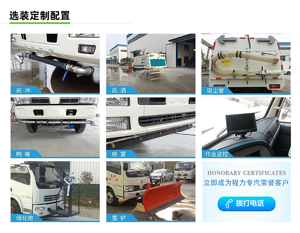 可加装前冲、后洒、喷雾、自洁卷盘、作业监控系统、辅助吸管装置、推雪铲等。