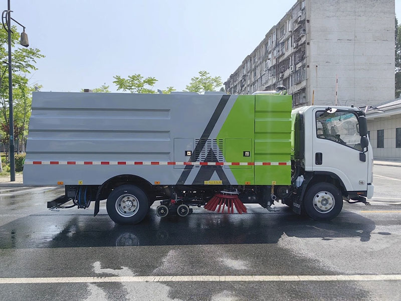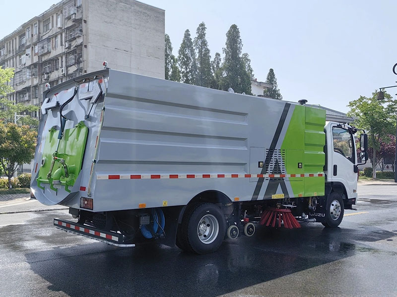 上装配置:副发动机是康明斯140马力,箱体材质为304不锈钢,垃圾箱容积4.5立方,清水箱容积5立方,清扫宽度:2800-3200mm,保洁作业速度15-20km/h, 最大清扫能力48000㎡/h , 德国进口高压泵(前冲/侧喷/中喷/后喷雾/冲洗水枪/垃圾箱自洁装置),水过滤器,管路,不锈钢喷架,高压喷嘴,清吸降尘左右前扫盘,吸尘吸盘,带2个中置扫盘,LPC电子控制,一键操作,尾部厢体外观为方形豪华型,日本三洋马达;万向高压路沿清洗喷头,威龙低压泵(前冲);不锈钢管高压管路;德国控制器, PLC一键控制;尾部LED箭头灯;副机转速表、副机水温表、机油温度报警装置、各种操作控制开关;倒车及洗扫状态室内监视器。18m高压冲洗卷盘。清洗压力10MPa;吸入颗粒度:≥100mm。