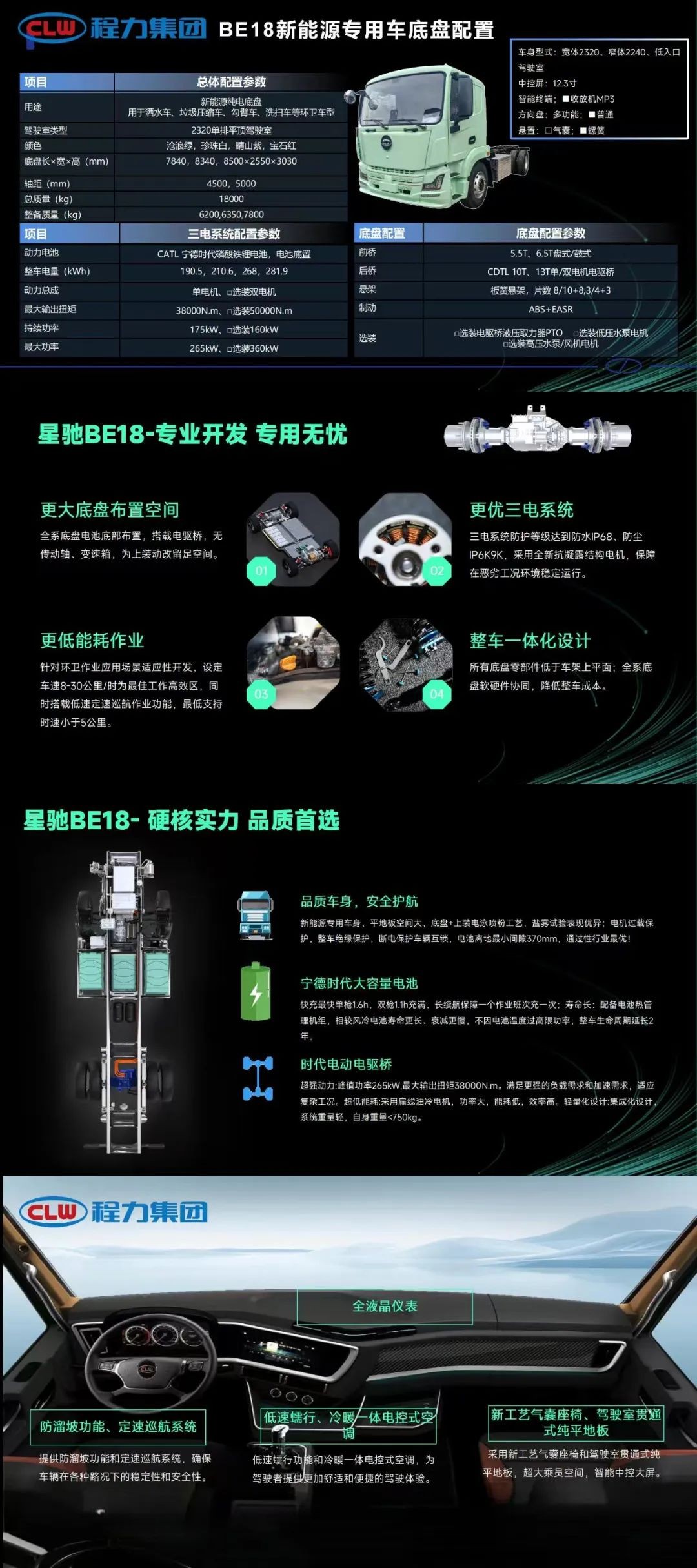 程力“星驰”BE18新能源商用车底盘,适用于改装全系环卫车、工程车、应急保障类车辆,性价比高适用性强。