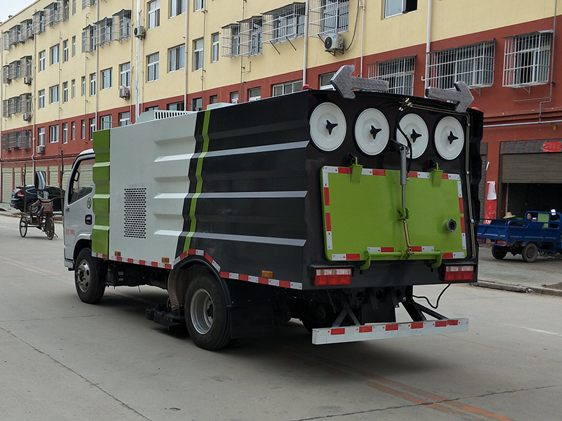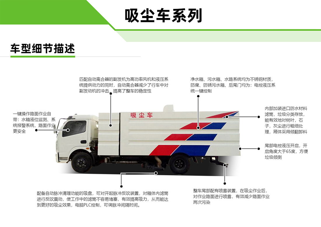 东风小多利卡5方吸尘车专用配置:尘箱:4立方米,水箱:1立方米;中置吸盘、江铃五十铃副发动机、施耐德控制开关、海普瑞斯电磁阀组、无级变速自动离合器、免维护离心式风机、高精度垃圾箱过滤系统(最高可达0.5微米),不锈钢垃圾箱、进口脉冲阀、垃圾箱举升自卸、尾部LED箭头灯、车尾雾状喷水润湿功能、倒车影像、手动泵应急系统。