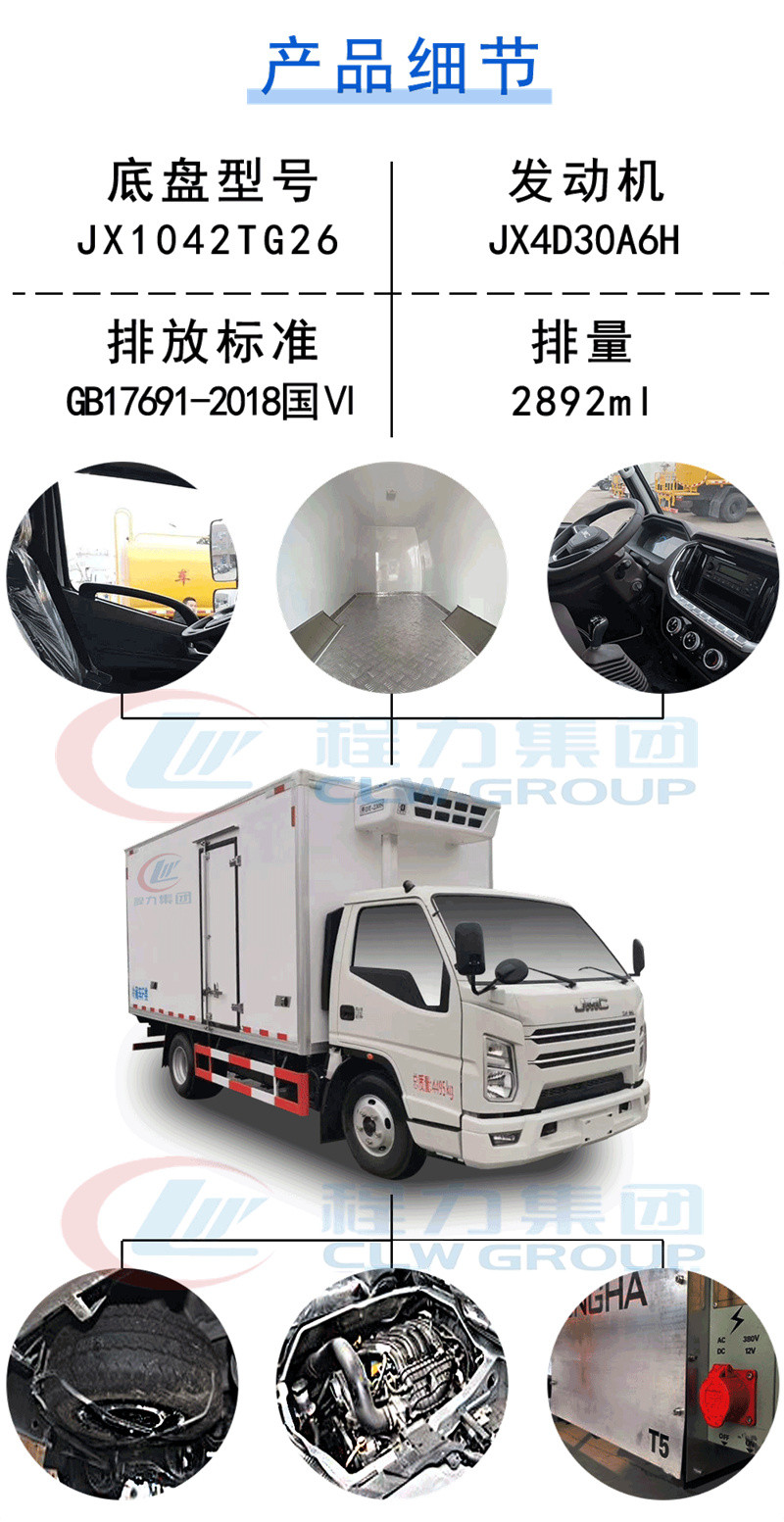 | 其他 | 车厢顶部封闭,不可开启,导流罩为选装件,选装无侧开门结构,选装厢体侧面开门样式,选装制冷量相同的制冷机组。ABS系统型号:APG3550500A,ABS系统生产厂家:浙江亚太机电股份有限公司;ABS系统型号: VIE ABS-II,ABS系统生产厂家: 浙江万安科技股份有限公司。侧防护采用冷弯型钢/Q235-B,螺栓连接,后防护采用冷弯型钢/Q235-B,焊接连接,后防护截面高度尺寸100mm,截面宽度尺寸50mm,下边缘离地高度420mm。发动机型号/油耗申报值对应关系为:JX4D30A6H/11.4L/100km,JX4D30C6H/11.4L/100km,JX4D30B6H/11.4L/100km。 | ||