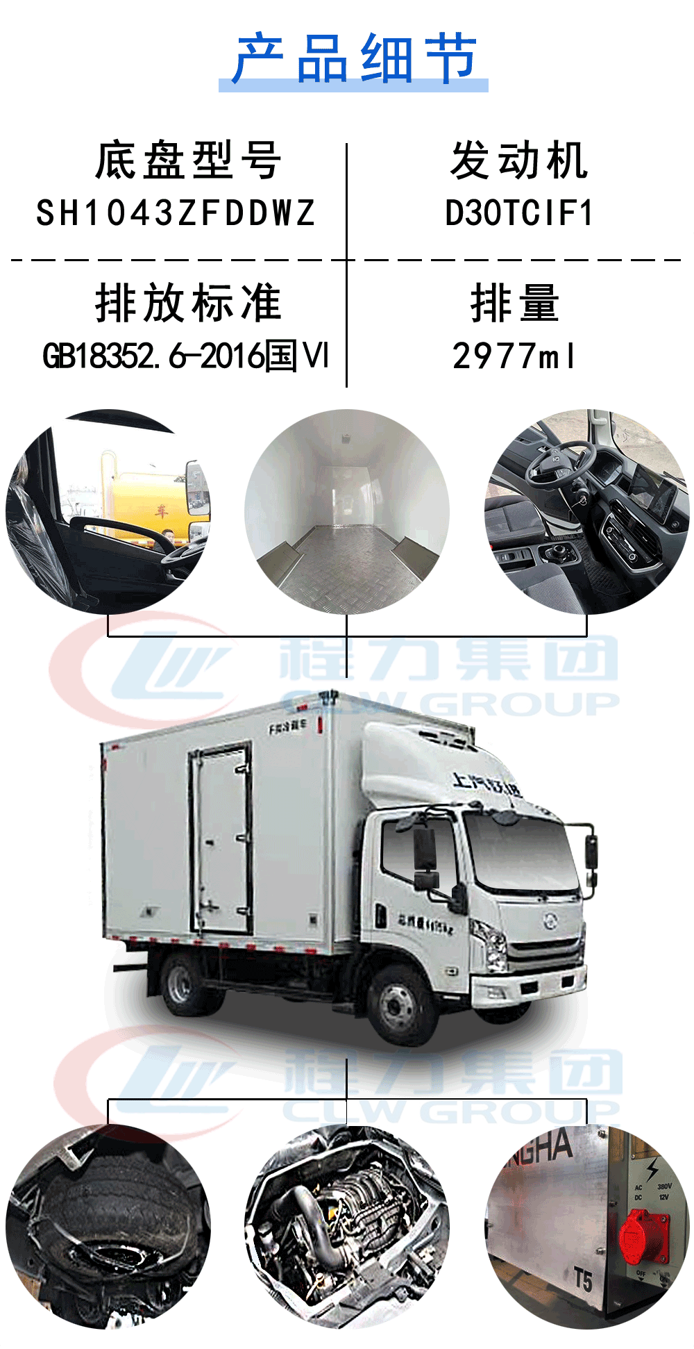 其它:2050宽体驾驶室,助力,动电门窗,双架支冷藏专用底盘,室驶驾空调,01寸液晶屏+倒车影像,电子手刹,智能仪表,ABS,定速巡航,控遥钥匙。